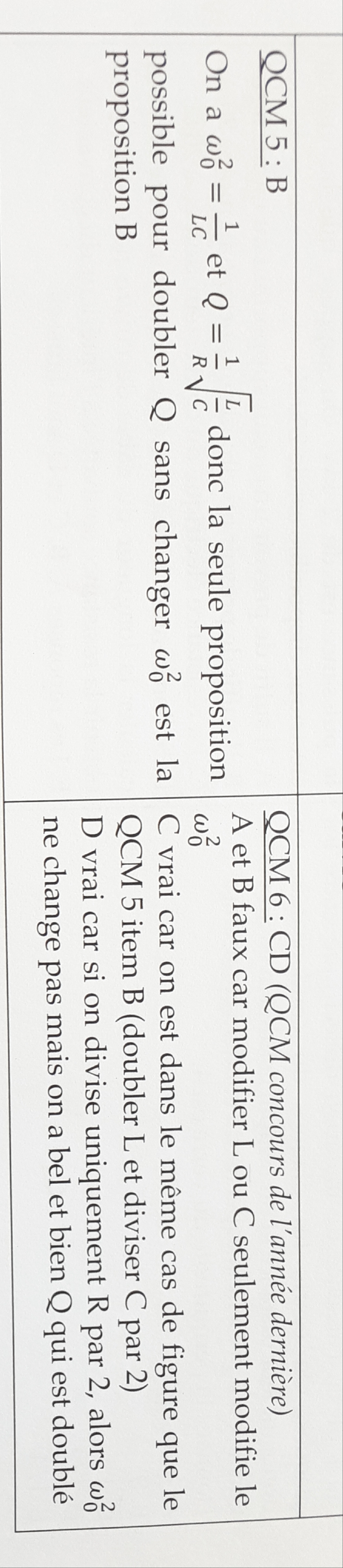 item D : Ici, on divise R par 2 donc on x Q par 2, ça ne change toujours pas la formule de la fréquence puisque la résistance n'y apparaît pas. L'item D est vrai !