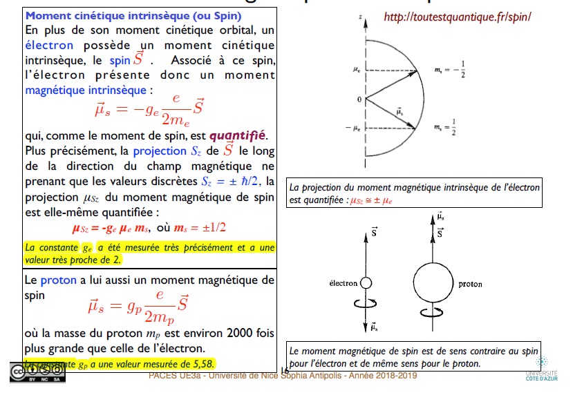 Par rapport au QCM du prof on compte faux « Le rapport gyromagnétique associé au spin du proton est (gpe) / (2mp) où g est une constante de gravitation intrinsèque au proton ».