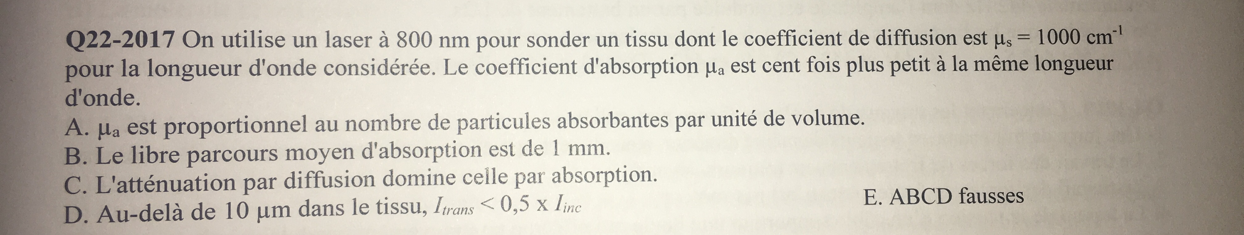 Dans un QCM il faut savoir si "Au delà de 10 microns I(trans)<0,5 x I(inc)" du coup on fait le calcul I(trans)= I(inc) exp(-mu l) et on trouve que I(trans)/I(inc) < exp(-1) et dans la correction on nous dit que du coup 0,37 < 0,5 du coup c'est faux.