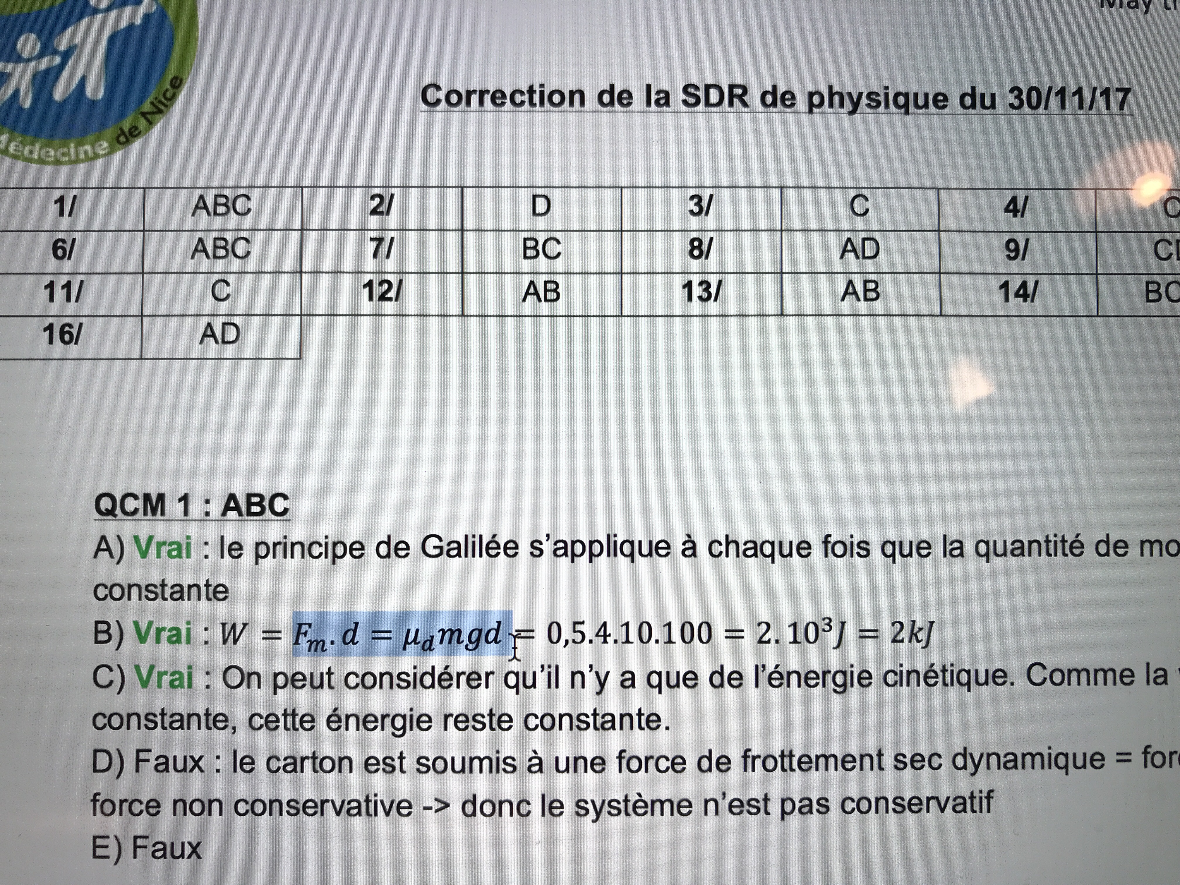 Salut , j’ai un petit problème avec la formule surligné dans la photo elle correction QCM 1 SDR de l’annee Dernière et pour moi il y a un - : u-mg x d