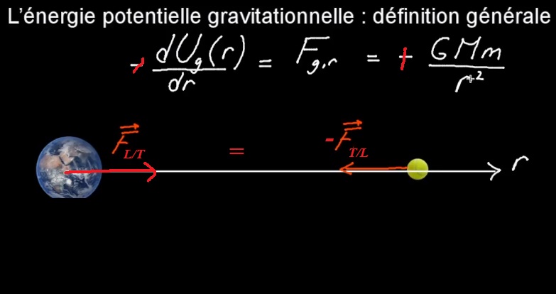 2.Maintenant si l'on part de l'origine de la terre, r et F sont de signes opposés donc :