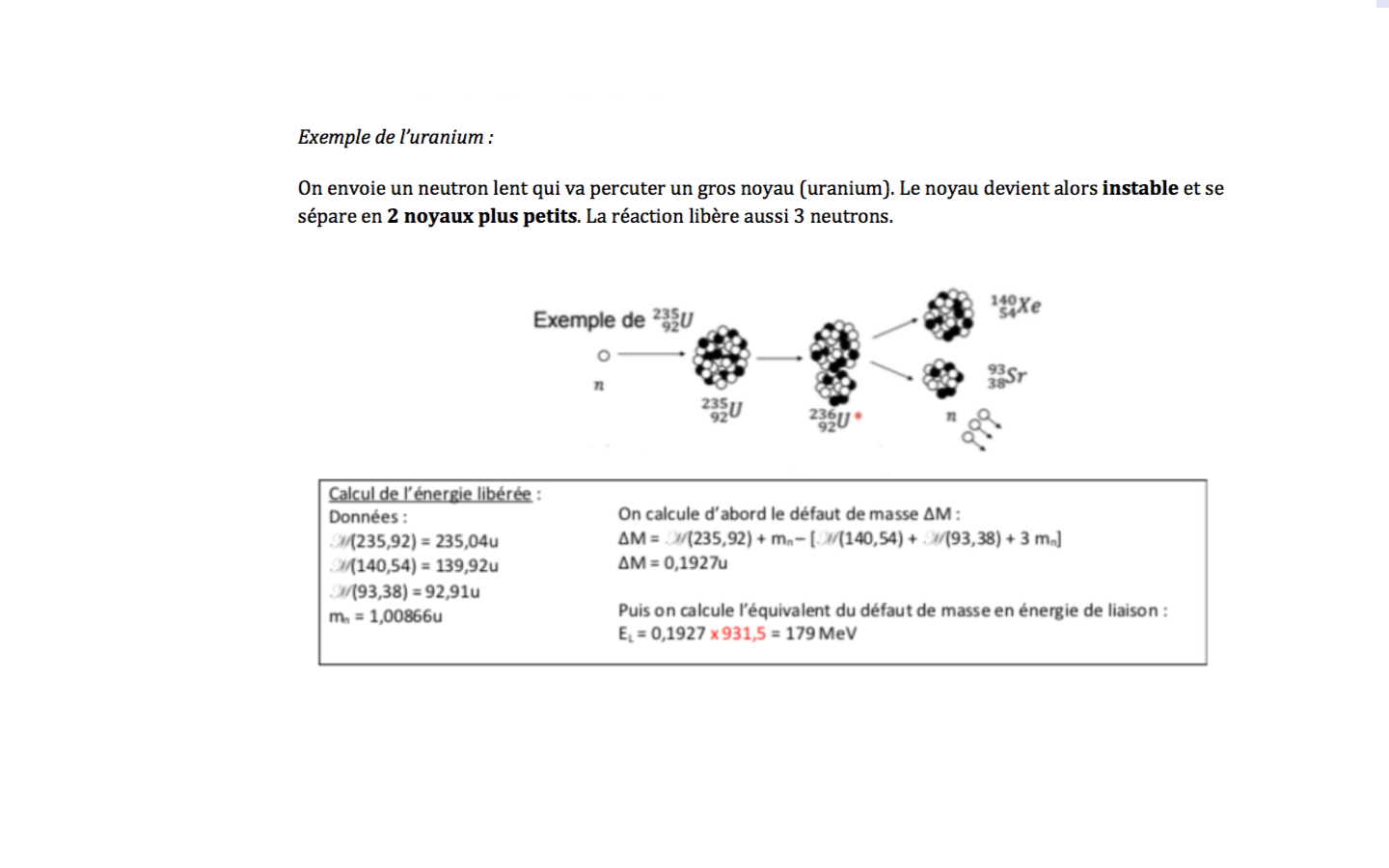 Donc pour le calcul du défaut de masse tu soustrais la masse du neutron et de l'Uranium 235 à l'atome de Xe, Sr, et aux 3 neutrons.
