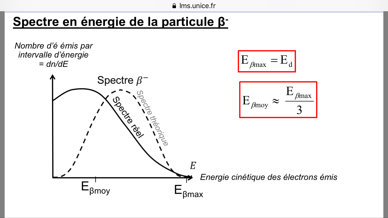 Dans le cas d'une désintégration bêta -, l'énergie libérée se répartit de manière aléatoire entre la particule bêta - et l'antineutrino. On peut donc avoir plusieurs cas de répartition d'énergie dont un qui est le cas où c'est le négaton qui emporte toute l'énergie libérée, ce qui nous donne: Ed = E bêta max.