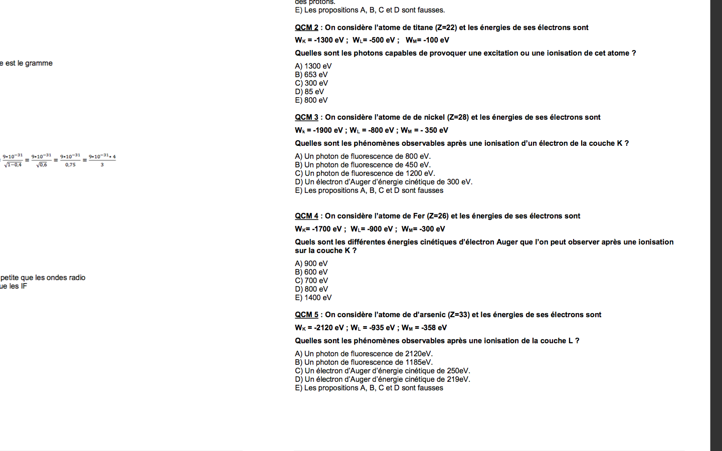 :arrow: Pour calculer l'énergie cinétique de l'électron Auger, il faut prendre l'énergie d'un photon de fluorescence à laquelle on soustrait l'énergie de liaison d'un électron (IWKI, I WL I ou I WM I). Ici, en supposant que l'atome se désexcite par passage d'un électron de la couche L à la couche K, l'électron Auger (expulsé de la couche L) aura une énergie cinétique Ec = E2 - I WL I = 1100 - 800 = 300 eV. Donc item D = VRAI.