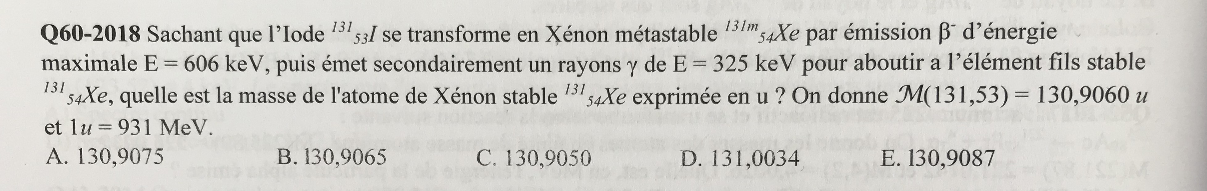 dans ce qcm la technique la plus facile est de choisir la masse qui est plus faible que celle de l'atome père mais ce que je n'ai pas compris c'est dans la correction lorsqu'ils développent le calcul ils utilisent 606keV et non pas 325keV...
