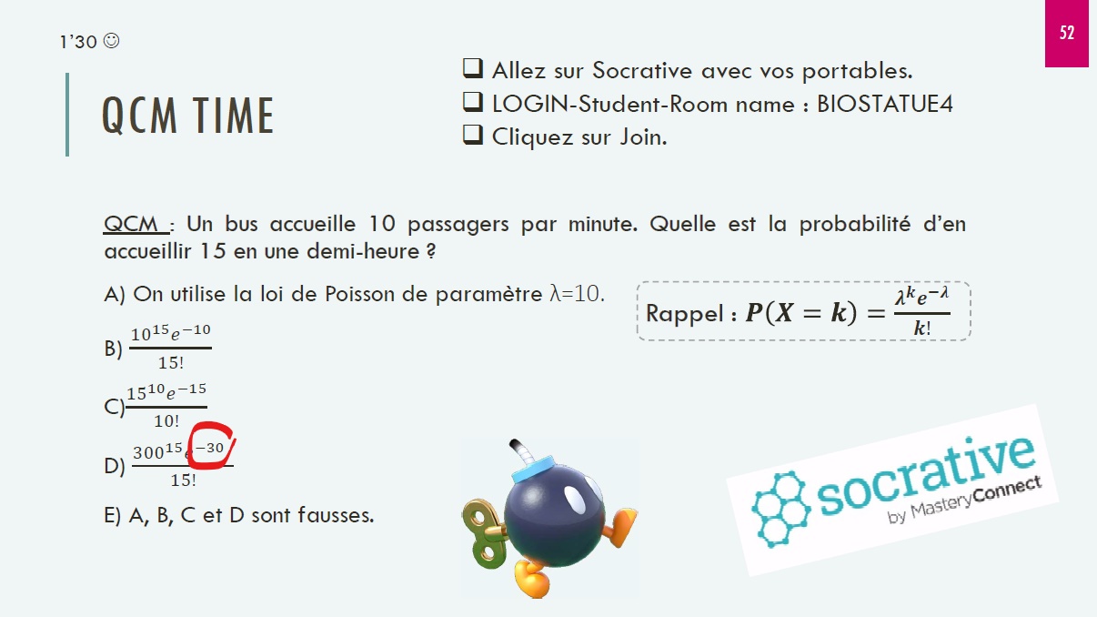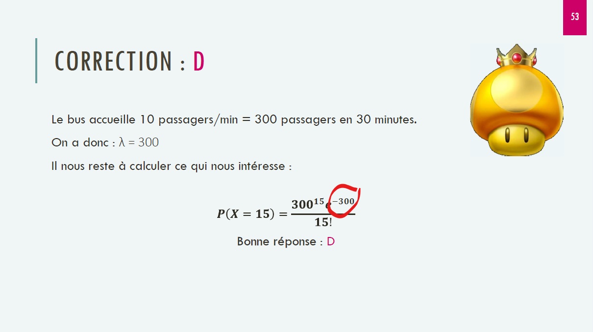 Je crois avoir trouver un erratum sur la dernière diapo du cours "Variables aléatoires, Lois de probabilités discrètes" car l'item D est considéré vrai mais la correction ne correspond pas avec l'item (un 30 -> 300)