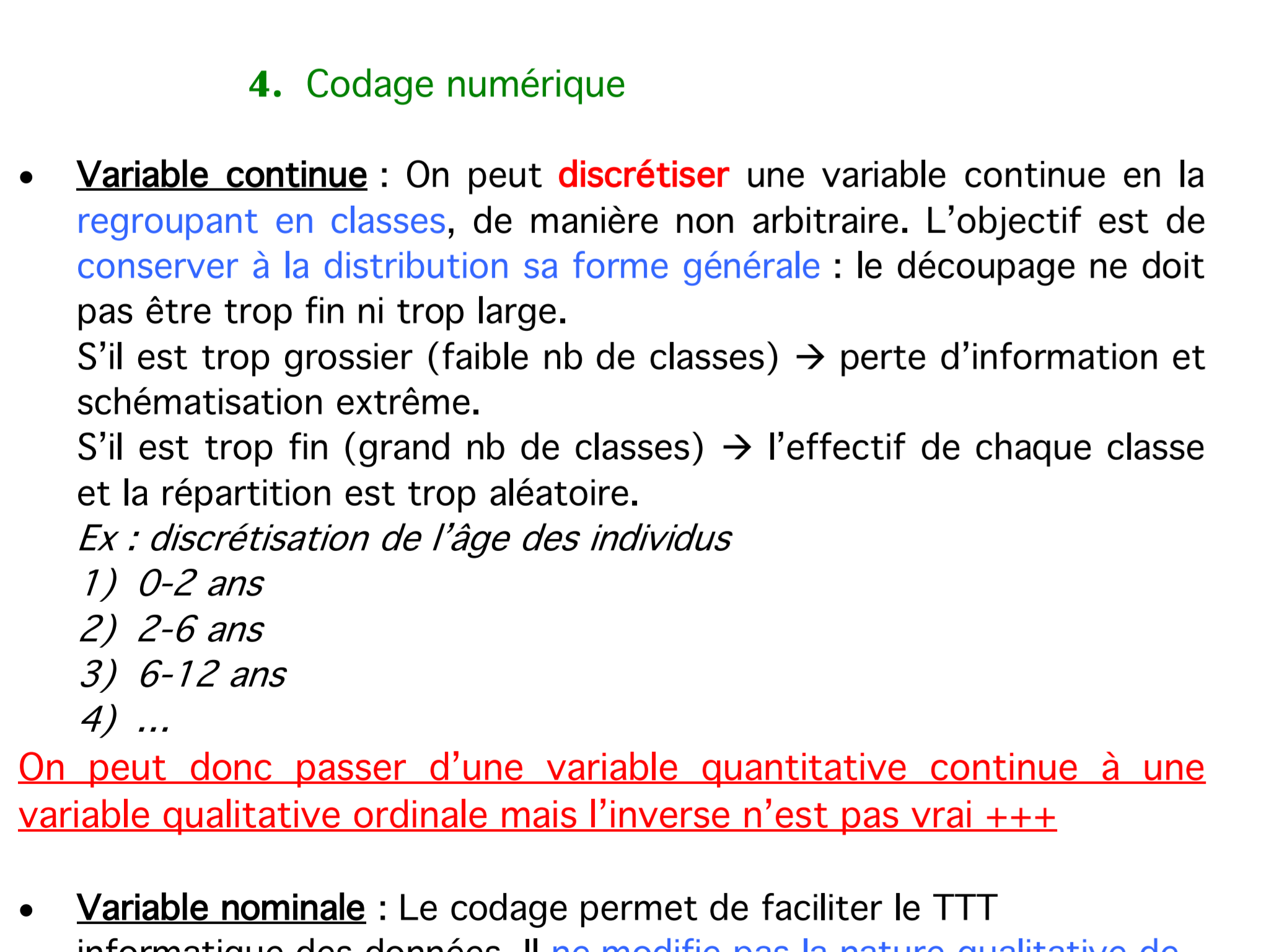 --> on peut choisir de créer de vraies catégories, qui correspondront à un "degré", par exemple : très jeune entre 0 et 20 ans, jeune entre 20 et 40 ans, âge moyen entre 40 et 60 ans... Ce sont des variables qualitatives ordinales.