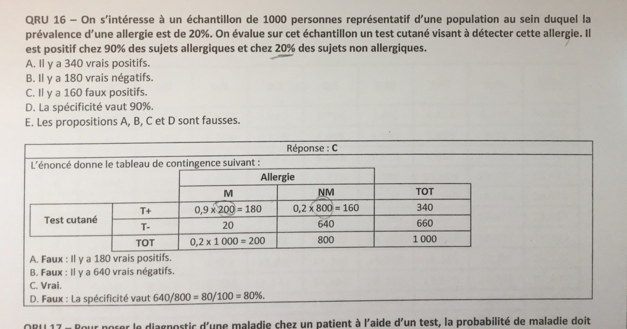 Pour la ligne du test positif, il faut que tu reprennes l'énoncé, il est écrit "il est positif chez 90% des allergiques", les allergiques sont les personnes malades ici, donc en fait sur 100 personnes allergiques, il y en a 90 qui ont un test positif. Donc pour 200 personnes, tu en as 180. C'est pareil pour les FP, en fait c'est un produit en croix comme au lycée