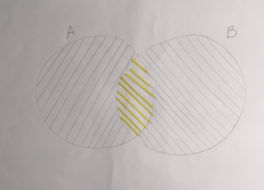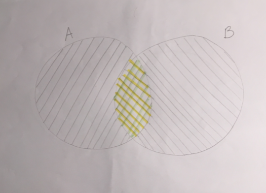 De manière générale, quand on prend un évènement A et un évènement B qui peuvent se croiser, si on fait simplement P(A) + P(B), on obtient une probabilité fausse, car on compte 2 fois les objets qui appartiennent à la fois à l'évènement A et à l'évènement B. Ici, on le voit car l'espace du milieu est rayé 2 fois, en jaune et en vert.