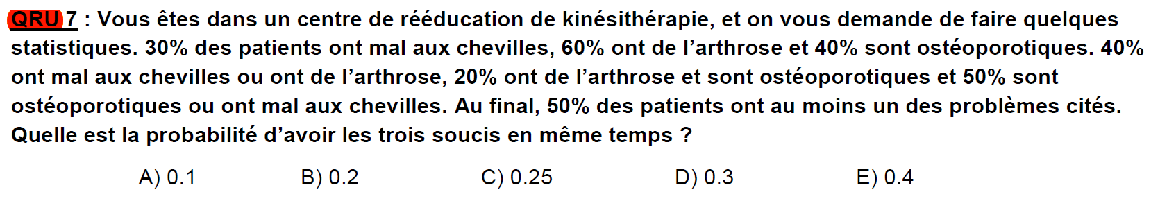 Du coup pour le QRU7, corrigeons-le ensemble ! On a ici la situation représentée sur un schéma, avec toutes les probas données dans l'énoncé :
