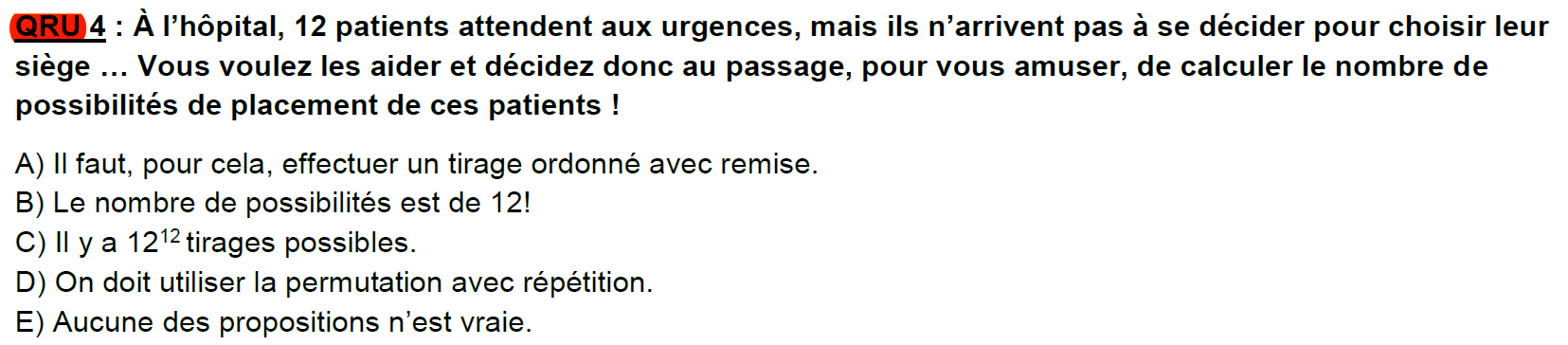 Concernant le QRU 4, imagine que tu numérotes tes chaises de 1 à 12. Si tu réalisais un tirage non ordonné, ça voudrait dire que n'importe quel patient peut se retrouver sur n'importe quelle chaise ; ça n'a pas d'intérêt ici puisque le problème des patients est justement qu'ils n'arrivent pas à choisir LA chaise qu'ils veulent. Il faut donc un tirage ordonné.