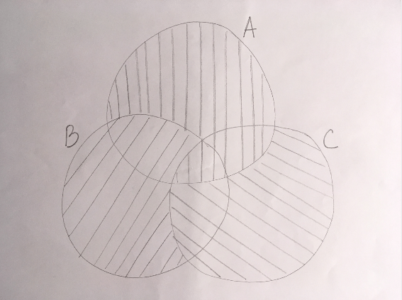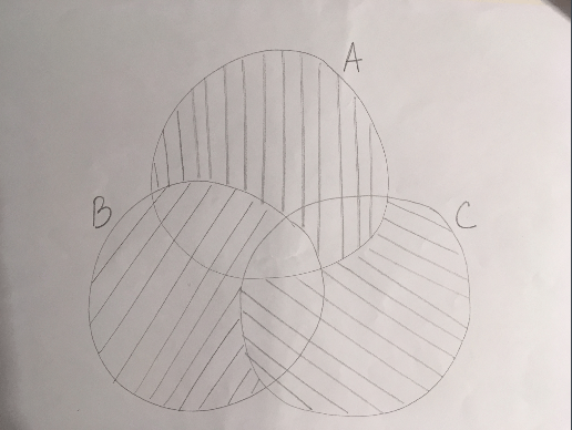 C'est sur ce même principe que, quand tu as retiré une fois chaque proba P(A inter B), P(A inter C) et P(B inter C), et que tu te retrouves avec plus du tout de hachures au milieu (donc excluant complètement la proba correspondant aux personnes appartenant à la fois à A, B et C), tu dois rajouter une fois cette même proba, pour ne pas se retrouver avec "toutes les personnes appartenant à A, B ou C sauf les personnes appartenant à la fois à A, B et C".
