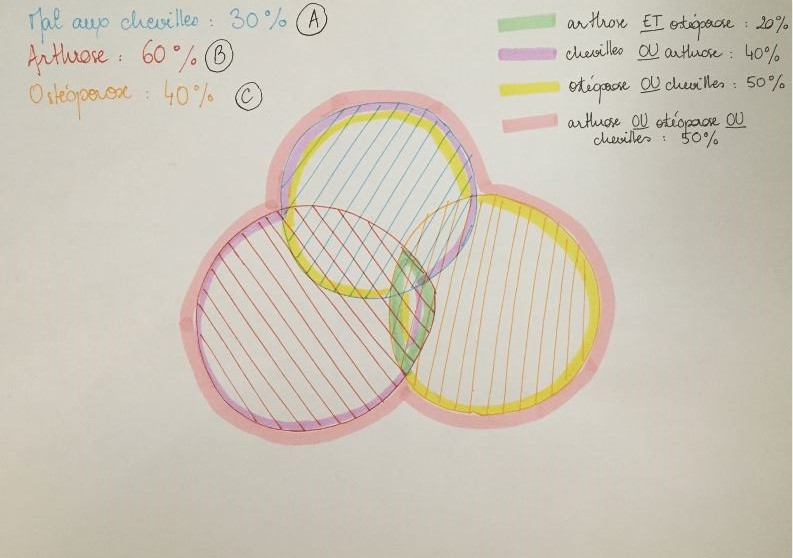 On pose A = "mal aux chevilles", B = "arthrose" et C = "ostéoporose". On a du coup, donné dans l'énoncé :
