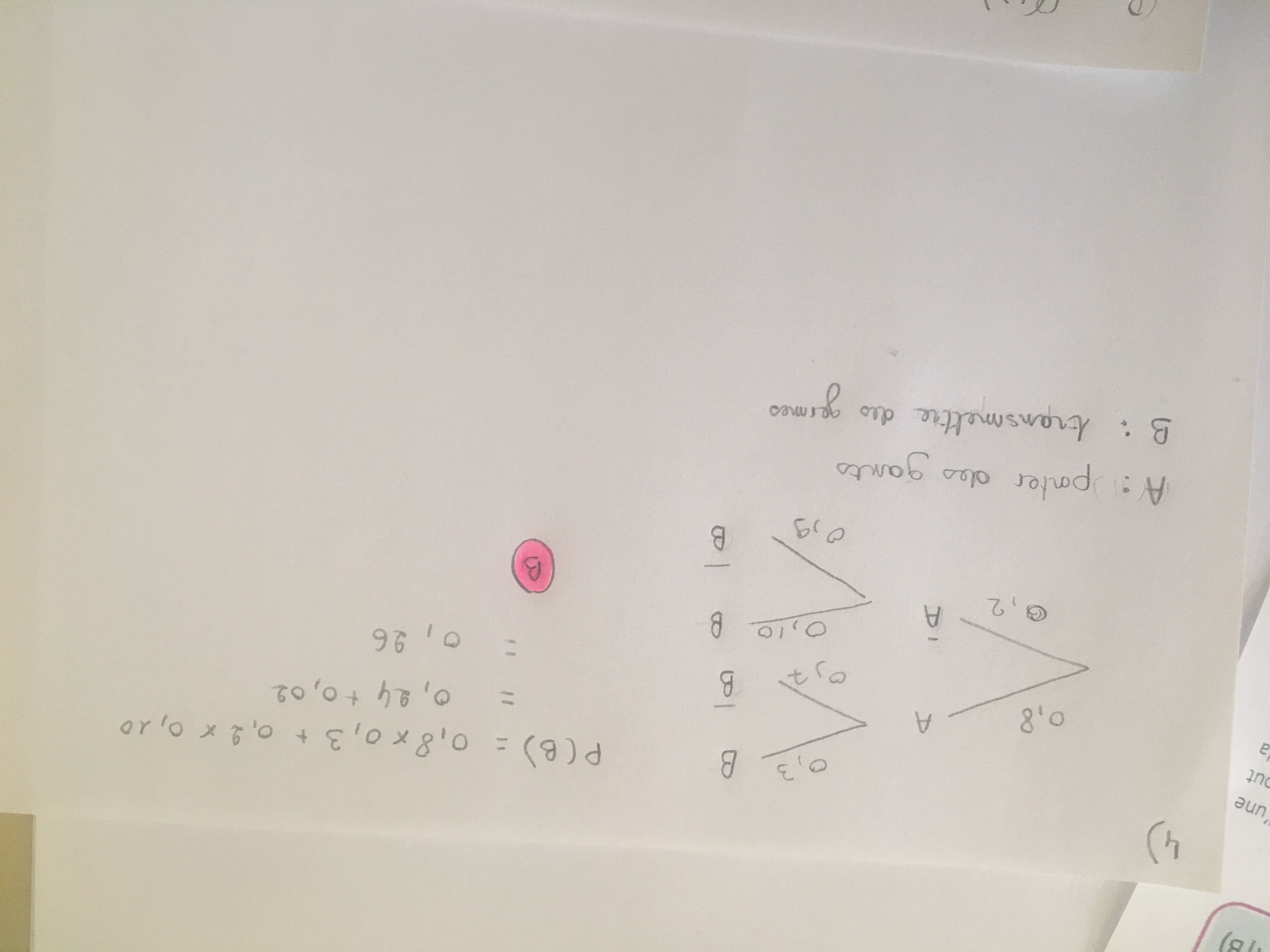 (intersection) l'événement B donc Abarre inter B. Du coup ici il ne fallait pas mettre 10% et 90% dans ton arbre car ce ne sont pas des probabilités conditionnelles (il ne faut pas confondre probabilités conditionnelles et intersection). Donc P(Abarre inter B) = 0,1