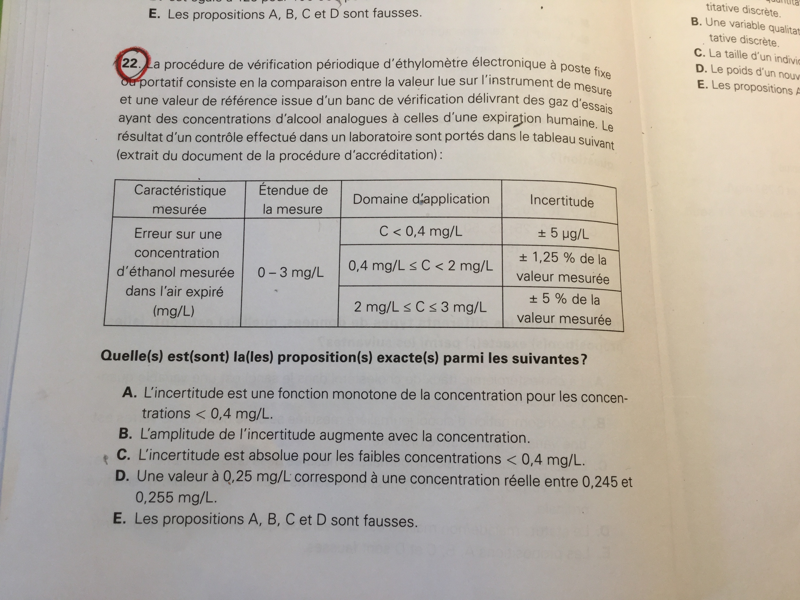 " Il faut comprendre dans l’énoncé que l’incertitude suit une loi monotone et constante quelle que soient les valeurs dosées jusqu’à 0,4 mg/l c’est donc une valeur fixe.