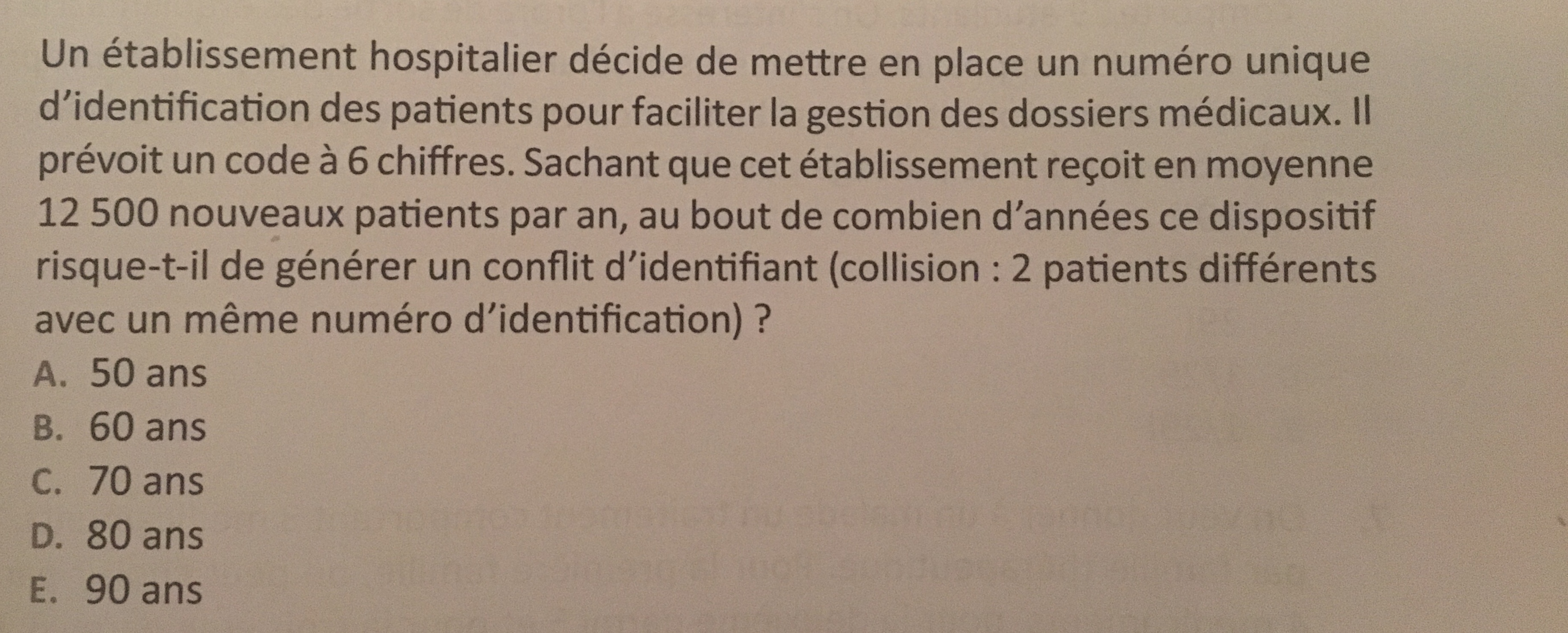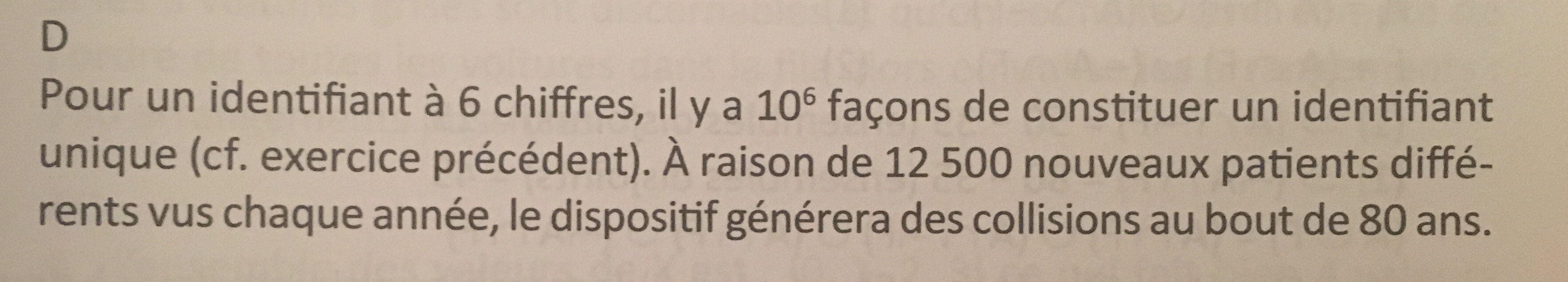 Comme tu l'as compris, on prend un nombre de possibilités à 106 donc tu as un million de codes possibles. Le but de la question est de déterminer au bout de combien d'années tous les codes seraient utilisés sachant qu'on a 12500 patients par an. En gros en combien de temps on aurait 1 million de patients auxquels on aurait attribué tous les codes possibles et on serait donc dans l'obligation d'attribuer un code qui avait déjà été attribué ! :P