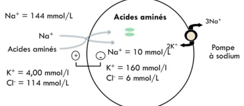 créant un PC pour le Na+ grâce à un transport actif ça va avoir des conséquences sur sa diffusion. Et dans ce cas, notre but est de faire rentrer des AA dans la cellule pour augmenter à nouveau l'osmolarité, cette entrée se fera