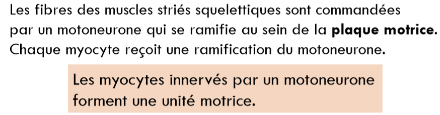 Dans le cours on dit que « chaque motoneurone commande plusieurs myocytes » mais c’est pas forcément le cas! Si on a un rapport optimal=1 il y a un motoneurone pour un seul myocyte! Et du coup on parle pas non plus d’unité motrice vu que « les myocytes innervés par un motoneurone forment une unité motrice » ici on a un seul myoxyte + un motoneurone