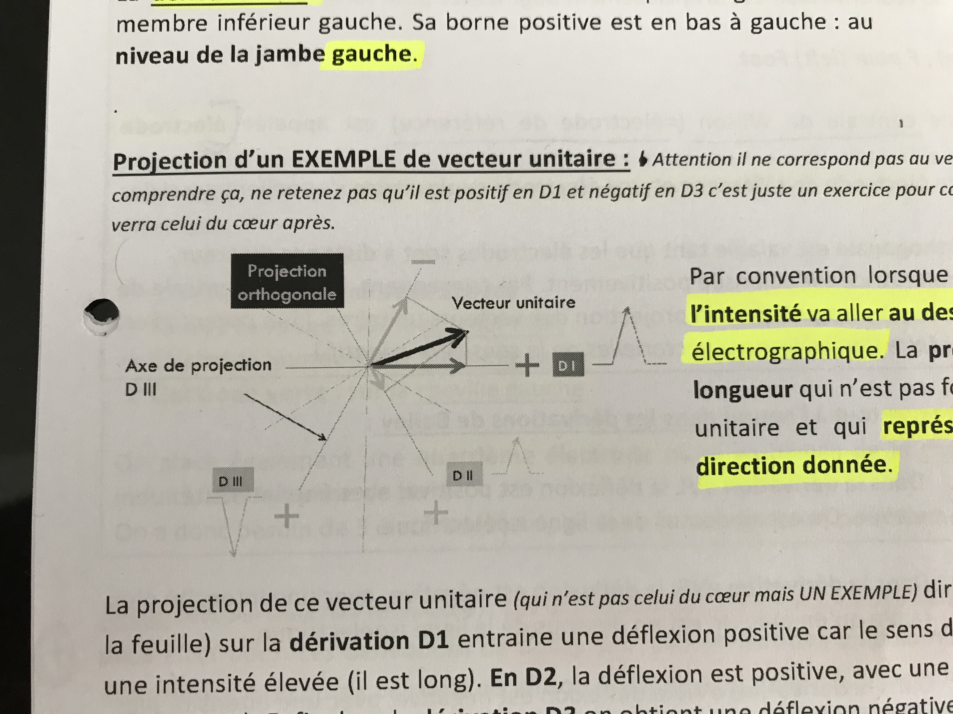 A propos de l'exemple je veux être sur d'avoir bien compris, le tracé du vecteur unitaire est obtenue grâce à la somme des déflexions en D1/D3/D2 grâce à la règle d'Einthoven qui nous dit que des électrodes placées suffisaient loin du coeur enregistre les courants induits en un seul vecteur. Toujours pour bien comprendre, la longueur de celui ci est représenté différemment selon sa force c'est à dire que si la dépolarisation était la même que sur l'exemple mais que le PE était plus fort on aurait le même tracé mais il aurait une longueur plus importante ?