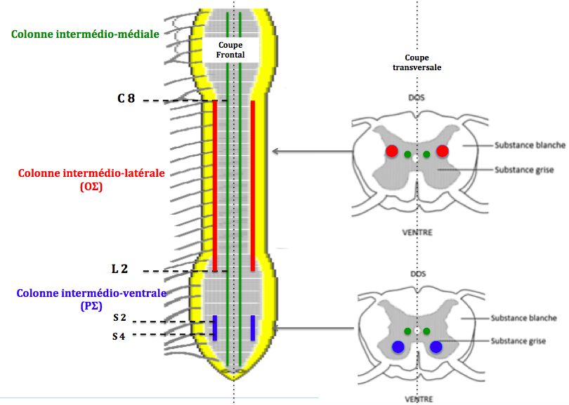 Pour l'orthosympathique : le neurone pré-ganglionnaire ce trouve dans la colonne intermédio-latérale qui s'étend du myélomère C8 à L2 au niveau de la moelle spinale.