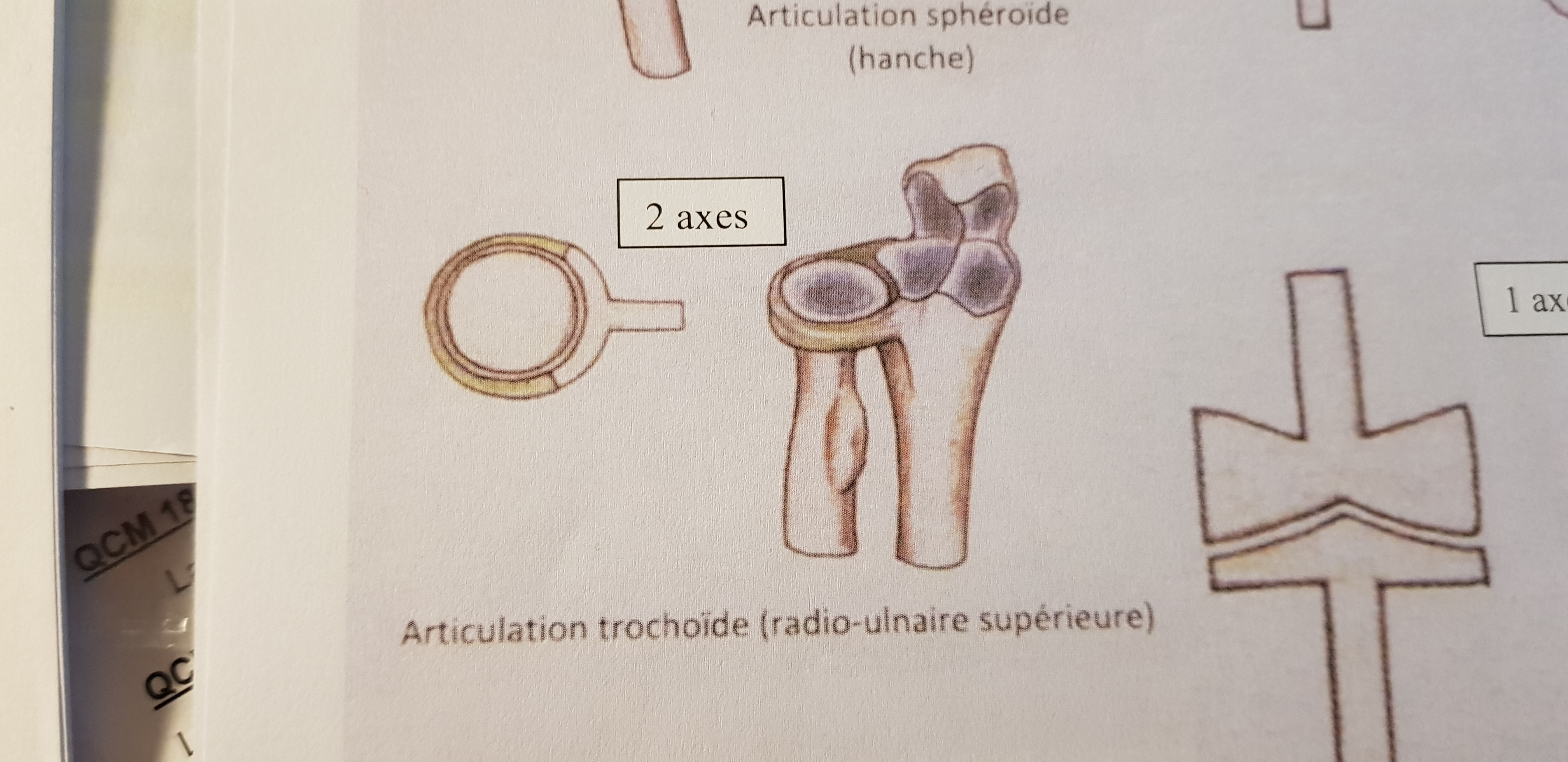 Puis j'avais une petite question pour les articulations trochoide/cylindroide: l'exemple souvent donnée est l'articulation radio-ulnaire qui est un fragment de cylindre, alors que par definition une articulation trochoide est une cylindre plein dans un cylindre creux - du coup je comprends pas toute a fait, est ce que vous pourriez m'eclairer? Et puis aussi savoir si De Pe serait capable de pieger sur cette petite nuance?