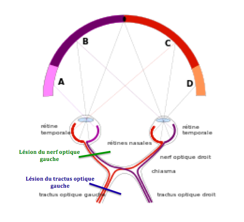 Exemple pour une lésion du tractus optique gauche -> On perd le champ rétinien temporal gauche donnant le champ visuel nasal droit et on perd le champ rétinien nasal droit donnant le champ visuel temporal droit.