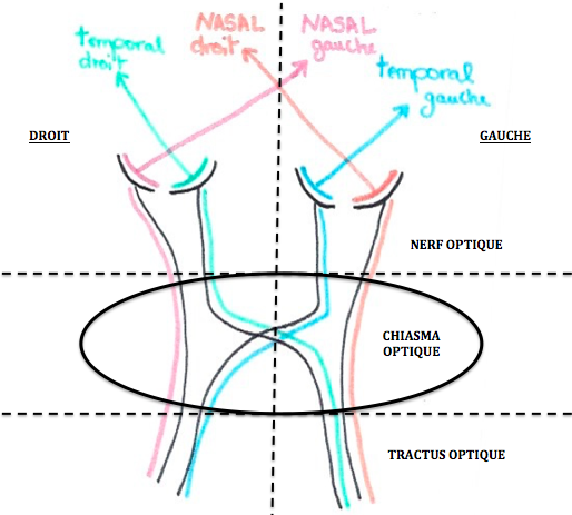 REM : les fibres nerveuses venant des champs rétiniens nasaux vont décusser au niveau du chiasma optique pour aller en controlatéral.