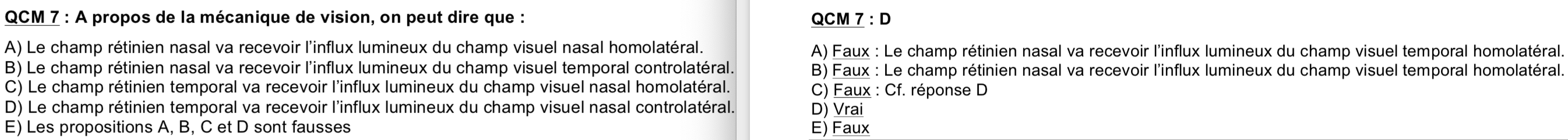 En fait, les champs visuels nasaux sont croisés et sont perçus par les champs rétiniens temporaux controlatéraux. Ceci n'est pas valable pour les champs visuels temporaux (pas croisés) qui sont perçus par les champs rétiniens nasaux homolatéraux.