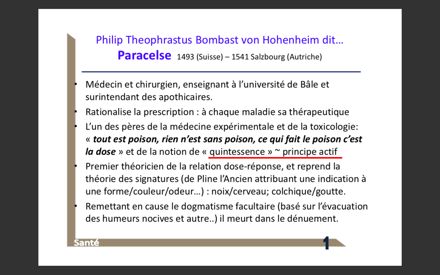 J'aurais aimé avoir une précision en ce qui concerne le passage sur Paracelse, dans l'Histoire du médicament, et le fait qu'il soit considéré comme le père de la quintessence/principe actif, que je ne suis pas sûr d'avoir bien interprété.