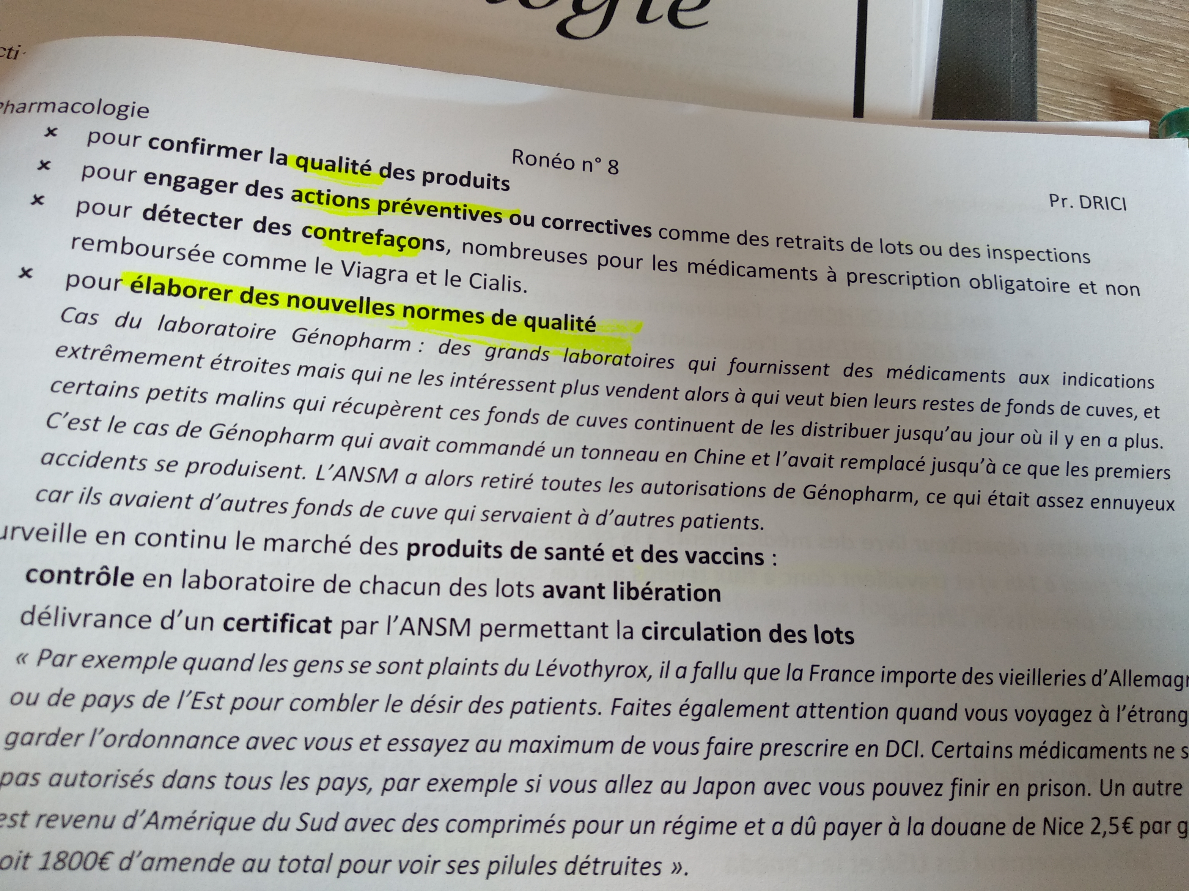 Ronéo 8 production des mdc il est dit que l ansm joue le rôle de contrôle en élaborant des nouvelles normes de qualité et pour illustrer cette action , on a le cas du laboratoire genofarm avec une histoire de fond de cuve vendue en Chine .