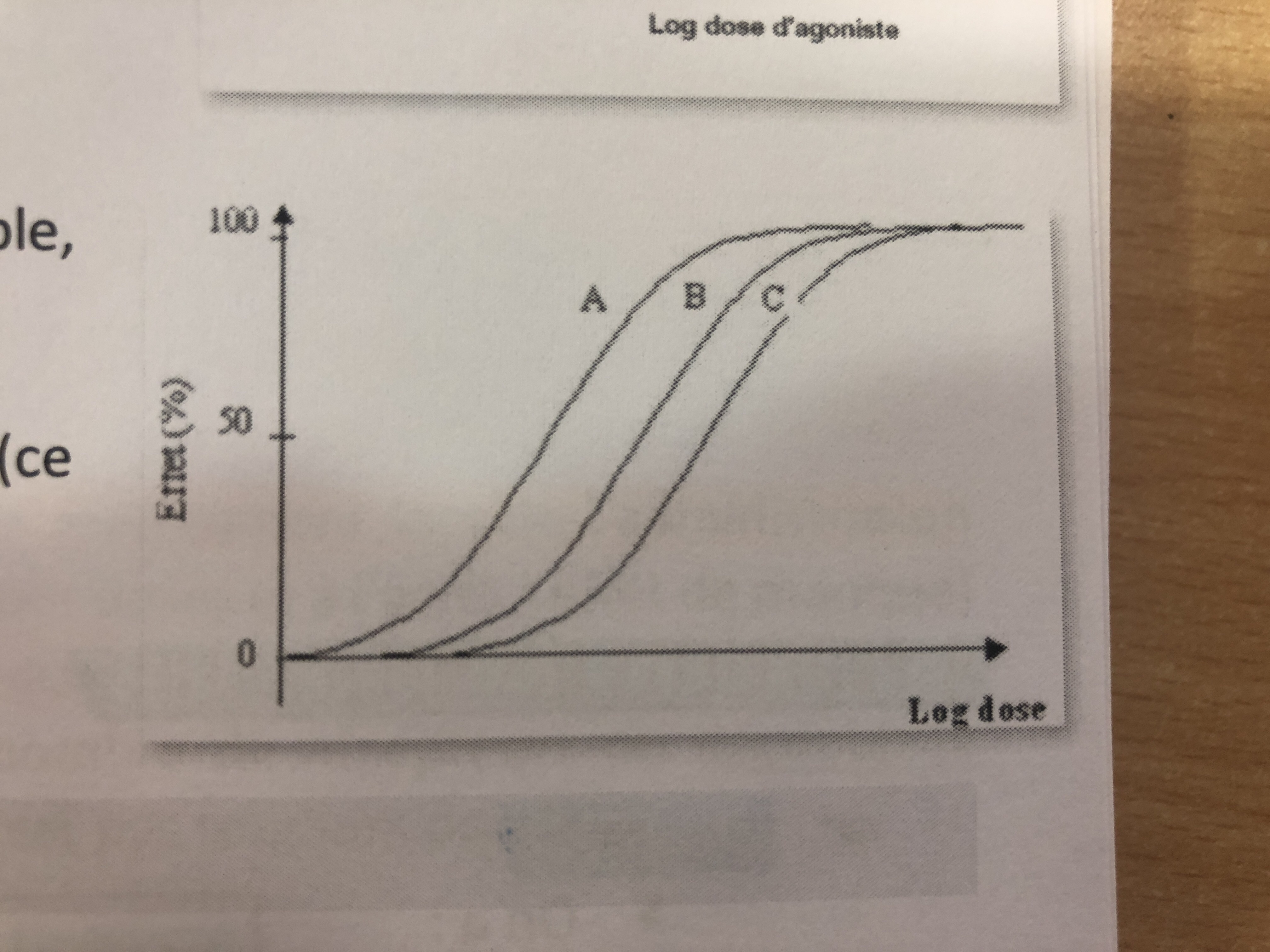 On calcule l’efficacité via la DE50. On voit donc que 50% est atteint pour une concentration plus faible pour la courbe À que la B donc pour moi efficacité : À> B > C