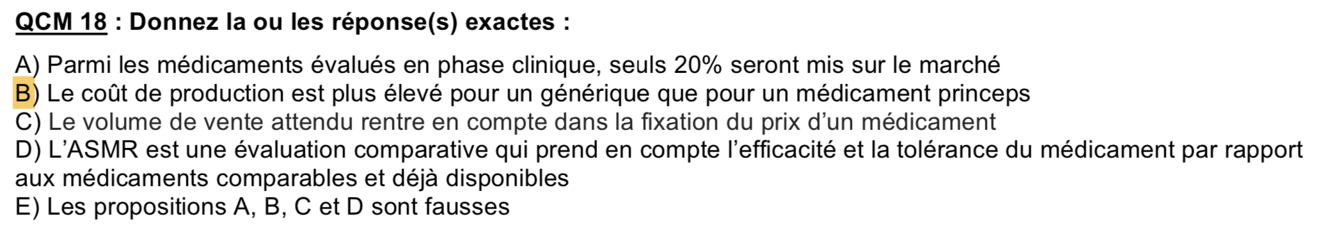 Salut, dans la partie "Développement et Production des médicaments" au QCM 18, l'item B est compté juste alors que pour moi ce serait plutôt l'inverse...J'ai bon ou c'est la version du QCM la bonne ?