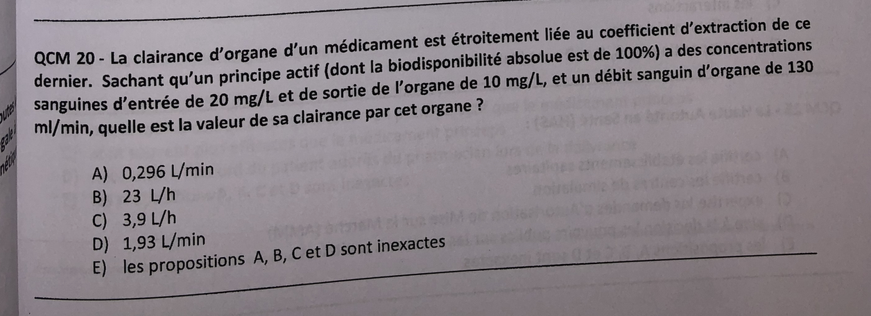 Pour ce qcm il fallait utiliser la formule de la Clairance d'un organe = Débit (Q) x Coefficient d'extraction (E)