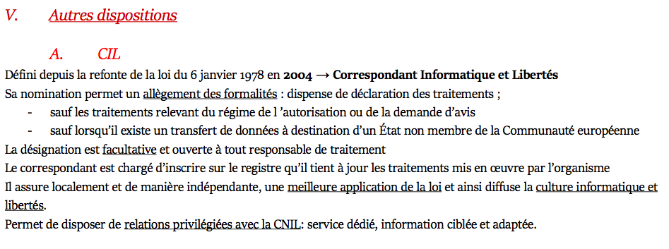 https://www.carabinsnicois.fr/phpbb/vie ... 20#p572920En gros, une entreprise / un groupe / une association peut (c'est facultatif) désigner un Correspondant Informatique et Libertés (CIL) qui aura alors pour rôle de veiller au respect de la loi Informatique Fichiers et Libertés (au sein de cette même entreprise / groupe / association). Il est le garant des données personnelles traitées par l’organisme qui l’emploie ou avec lequel il est en contrat. Il permet aux organismes et entreprises d’exercer leurs activités tout en protégeant les données à caractères personnels. Ce correspondant est chargé au sein de l’organisme de veiller à la bonne gestion et à la protection des données en accord avec les obligations légales prévues par la loi de 1978.