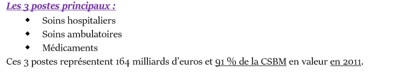 - croissance en volume : "L’indice de volume de la consommation de soins hospitaliers est proche de 3 % depuis trois ans. C’est ce qui explique que ce sont les soins hospitaliers qui contribuent le plus à la croissance en volume (+1,3 point) en 2011, suivis par les soins de ville (+0,6 point). Viennent ensuite les médicaments (+0,5 point) et les autres biens médicaux (+0,3 point) qui ont pourtant un poids nettement moindre dans la CSBM." du coup en volume les trois posts principaux = hôpital/ ambulatoire/mdc