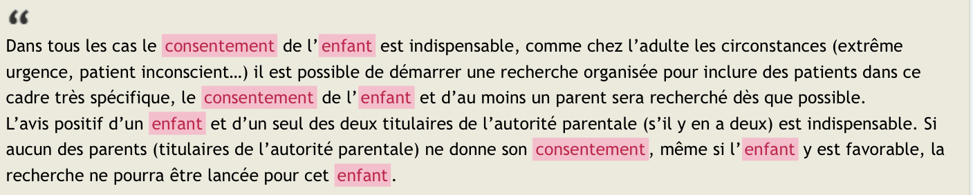 Dis moi comment tu fais pour expliquer et obtenir le consentement à un enfant de 2 ans qui se chie dessus et connaît 3 mots, que tu l´inclue dans une recherche qui porte sur la prise en charge oncologiques des leucemies en pédiatrie par exemple ? Bah tu vas lui dire coucou mon grand le docteur vas devoir faire une piquure mais tkt pas maman restera avec toi ! Et c’est tout.