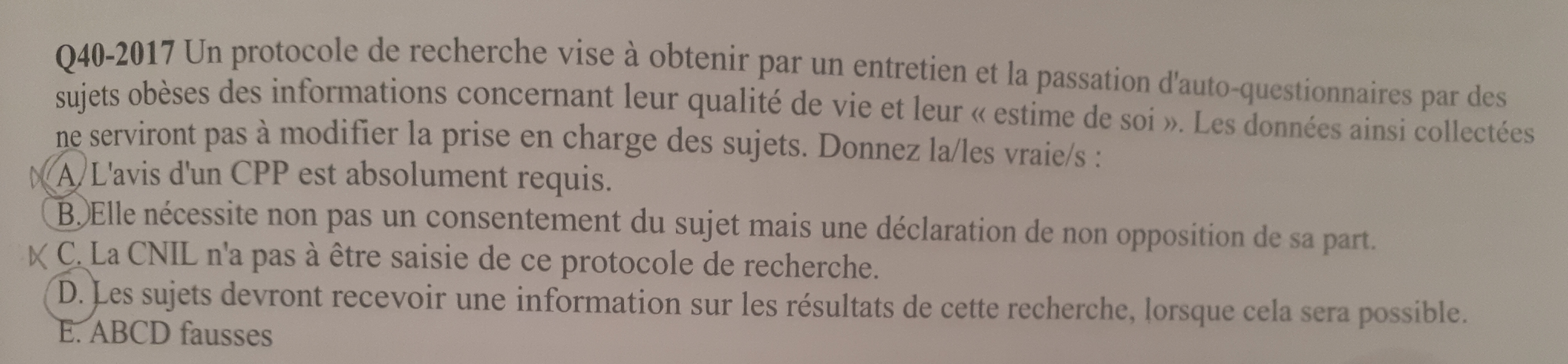 Mais si dans l'énoncé on enlève l'entretien, ça devient une recherche uniquement sur des données de santé (les questionnaires, il n'y aurait pas de contact avec les sujets ), alors dans ce cas l'item A est vrai ou faux ?