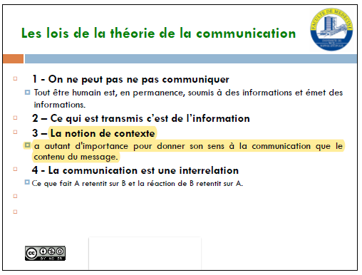 En ce qui concerne ton second item, on voit également dans le cours qu'il y a deux "éléments" ou bien deux "notions" dans la communication qui correspondent au contenu et au contexte. (Cf diapo ci dessous).