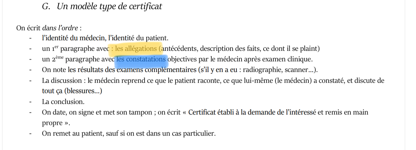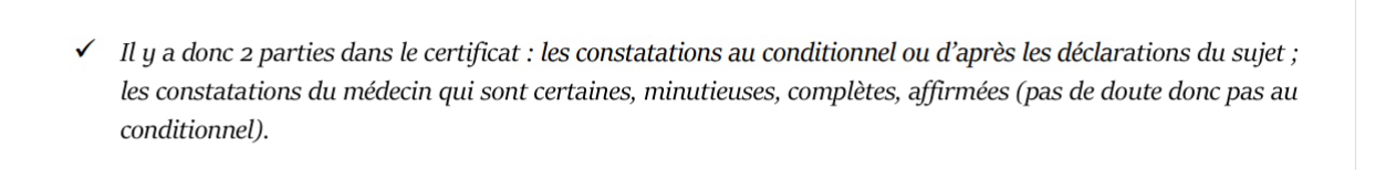 J'ai juste un problème avec l'item C de ce QCM: la prof a bien insisté sur le fait que la 1ère partie était constituée des ALLEGATIONS du patient: par exemple un patient qui nous raconte son agression. Pour moi on ne peut pas parler de "constatations" même au conditionnel, puisque le médecin ne constate rien de lui-même et se contente de retranscrire la version du patient.