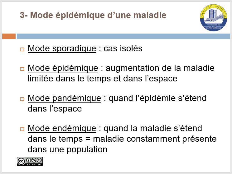 --> Mode endémique : quand la maladie s’étend dans le temps = maladie constamment présente dans une population