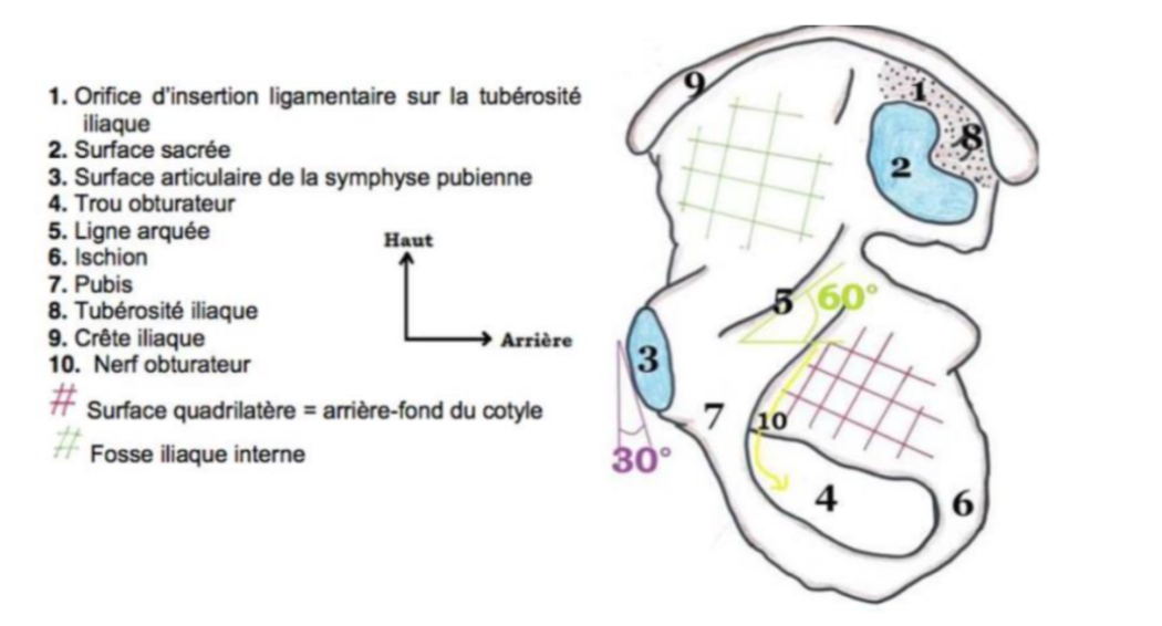 Si je te dis que la tubérosité iliaque (8) est en arrière de la surface sacrée (2), ta référence c'est bien la surface sacrée et non pas la face médiale dans sa totalité.