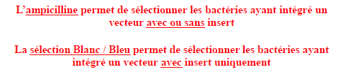 Sur la fiche 2, il est écrit que la sélection par antibiotique permet de sélectionner les bactéries ayant intégré l'ADN recombinant. Mais comme ADN recombinant = vecteur + insert, ce serait pas plus juste de dire que ce sont les bactéries ayant intégré le vecteur (avec ou sans insert) qui sont sélectionnées? Il me semble d'ailleurs que c'était un piège du CCB :P