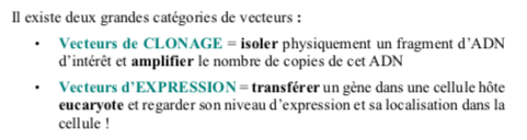 le vecteur d'EXPRESSION sert uniquement à transférer un gène pour voir son expression et sa localisation et NON à AMPLIFIER (qui est une fonction du vecteur de CLONAGE)