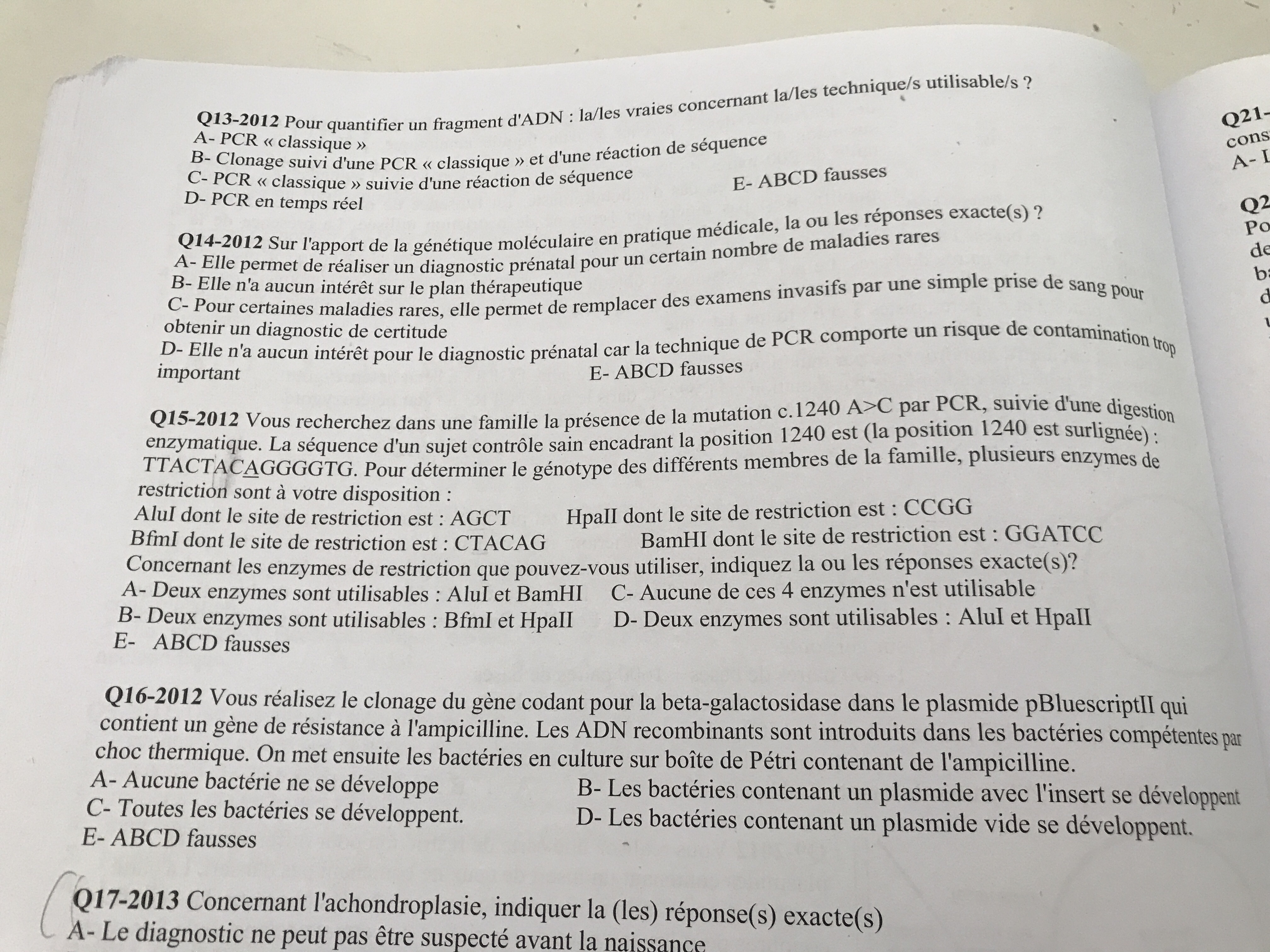 Salut, pour ce genre de QCM je prend l’exemple de celui ci mais même dans les autres je n’arrive pas à encadrer le bon morceau de la séquence du départ qui contient le nucléotide souligné pour pouvoir comparer avec les enzymes. Je ne sais pas si je suis clair mais genre en gros les enzymes on nou donne un fragments de 4 ou 6 nucleotides alors que notre séquence de base en a 14 donc genre trouver sur notre longue séquence le bon encadrement de 4 ou 6 nucleotides pour pouvoir dire qu’elle enzyme coupe :) je te met en photo le QCM ( c’est le 15 )
