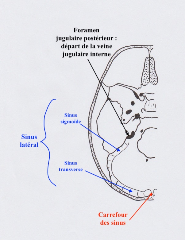 creusés entre l'occipital et le rocher de l'os temporal en ce qui concerne les sinus sigmoïde. En gros le sinus latéral se situe au niveau de l'os occipital. Par un double repli de la dure-mère, un véritable tunnel est formé au niveau de ses gouttières et dedans est