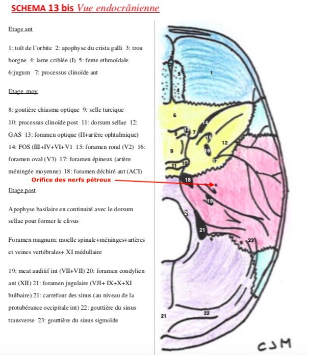 Alors oui en effet ils sont pas légendés sur le schémas car peu importants (le prof les site mais s'en fouuuut) Ces orifices des nerfs pétreux sont situés donc dans l'étage moyen, sur les parois supérieures du rocher.