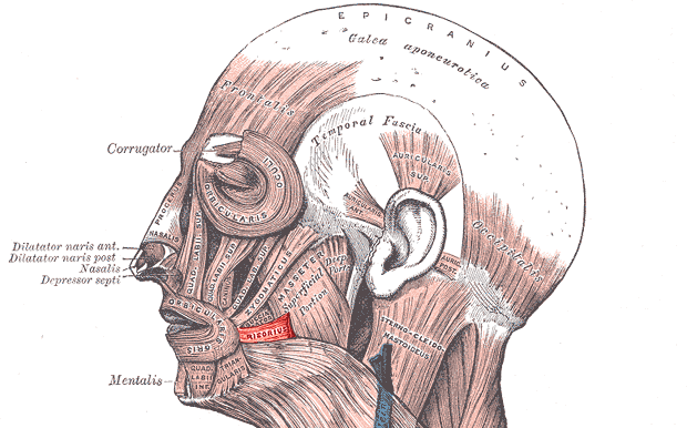 risorius en rouge qui est par dessus le buccinateur (que tu vois en profondeur, si tu fais attention au détail tu verras qu'il est même légendé)