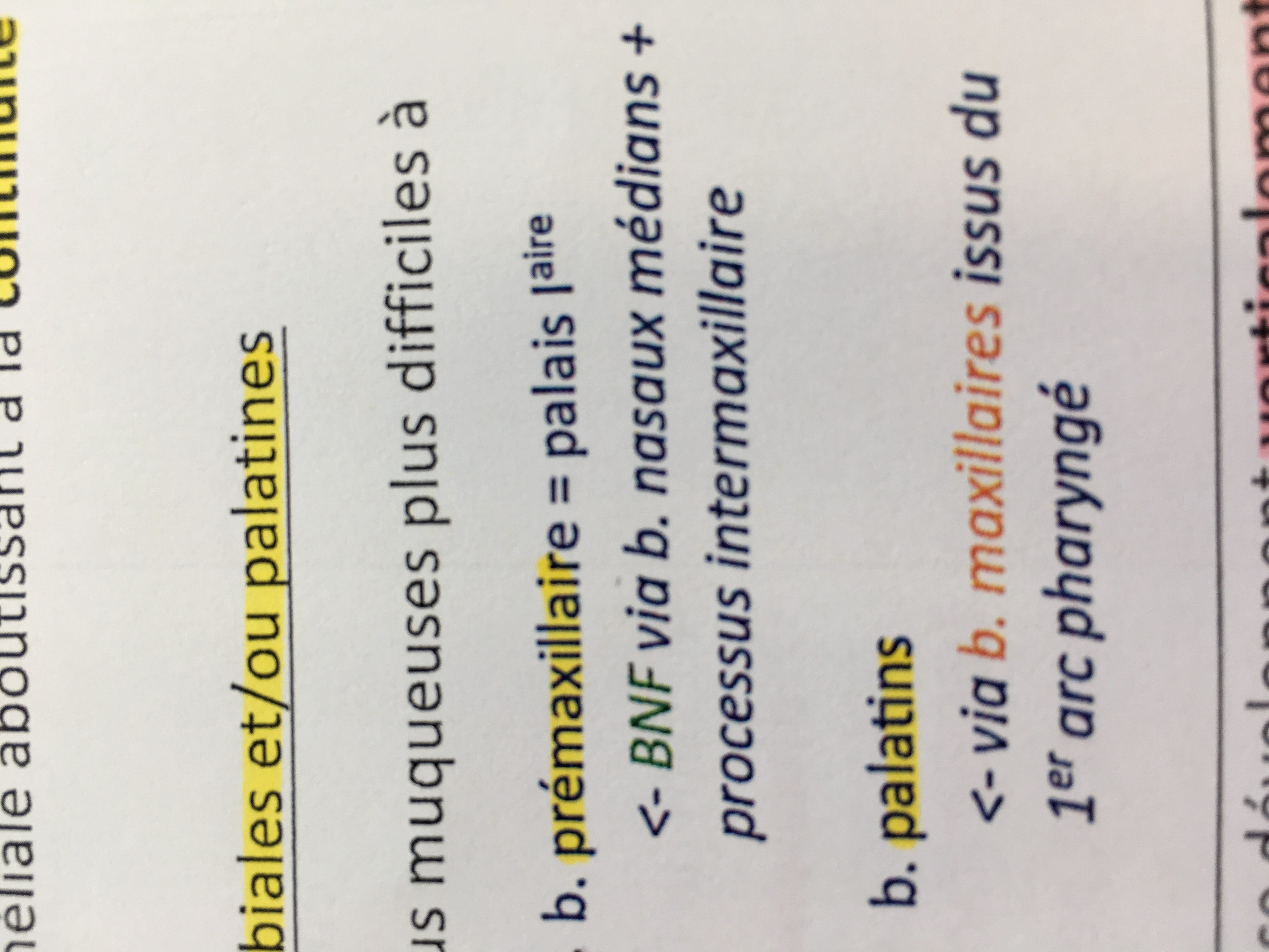 Donc c'est bien le BFN qui donne les BNM qui donnent le processus intermax lui même donnant entre autres le palais primaire mais si tu vois "Le bourgeon prémaxillaire ou palais primaire dérive du bourgeon nasofrontal via les bourgeons nasaux médians et le processus intermaxillaire. " tu le compte vrai +++ ( c'est QCM 5 annale 2016)