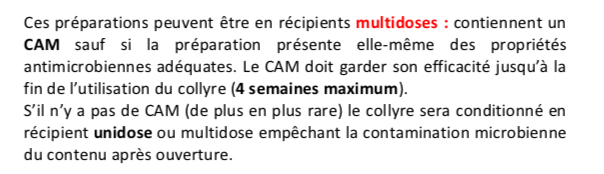 C'est nécessaire dans le cas des préparations multidoses (car il y a une entrée d'air, donc de microbes, qu'il faut éliminer). Dans les préparations unidoses, on met la totalité du produit juste après l'ouverture, donc pas besoin de conservateur.
