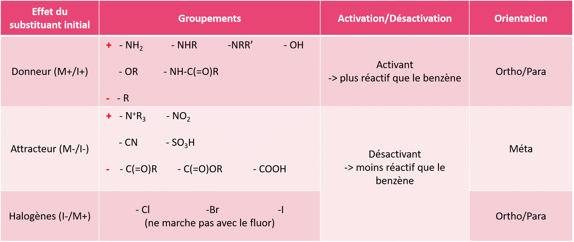 Cette fois ci, tu peux voir que ce sont des charges positives sur les sommets ortho et para. Donc un électrophile (qui est positif) ne pourra pas s'y substituer. Il n'a d'autre choix que les sommets méta. Ces groupements sont désactivant car ils enlèvent les charges moins, donc la réactions est plus compliquée mais faisable.